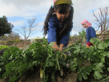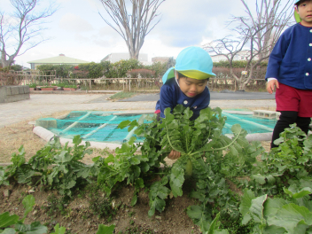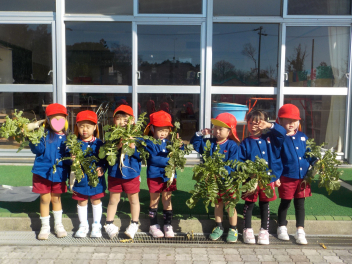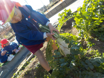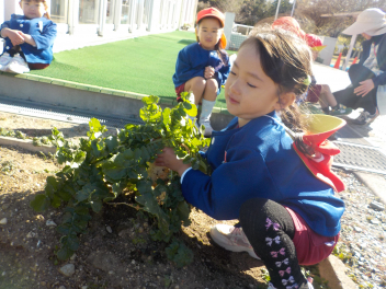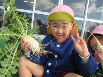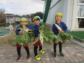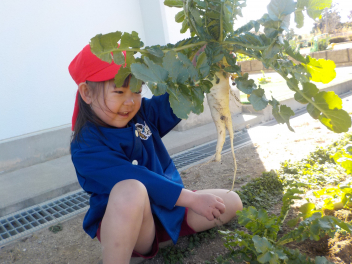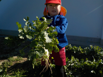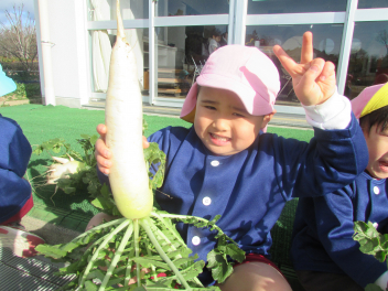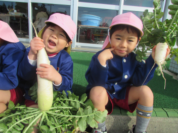 「やったぁ!大きい大根とれた!」「僕の大根は長いよ。」「足がいっぱいあってイカみたい。」「白くてつるつるしてる。」…大きさや形の違いなども楽しみながら収穫しました