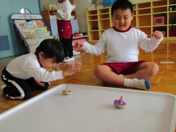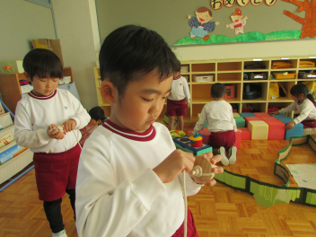 年中さんは、糸引きコマに挑戦 だんだん上手に回るようになりとても嬉しそうです