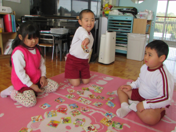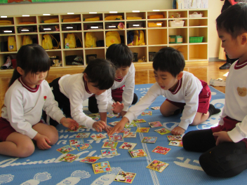 「この字、僕の名前と一緒だ!」「5枚取れたよー。」遊びながら文字や数にも興味をもっています