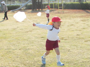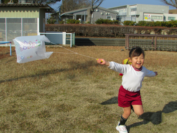 外では、凧あげも楽しんでいます 自分でつくった凧を片手に、風にのせたり園庭を走り回ったり