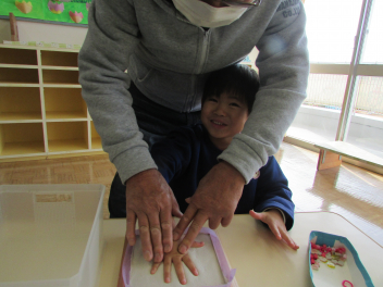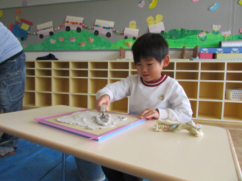 「やわらかーい。」「ちょっと冷たいよ。」珪藻土の感触も味わいながら楽しくできましたsad