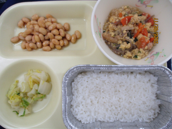今日の給食は、ごはん、牛乳、親子煮、白菜漬け、ぶどうまめでした。親子煮は、鶏肉と卵を使っているので、この名前がついています。ごはんが進むおかずでしたねlaugh