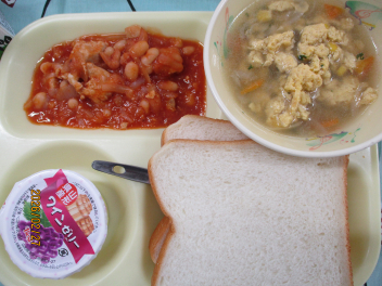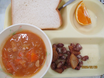 今日の給食は、食パン、牛乳、ミルファンティスープ、カチャトーラ、ワインゼリーでした。ミラノ冬季オリンピック開催にちなんで、今日の料理は、イタリア料理でしたlaugh