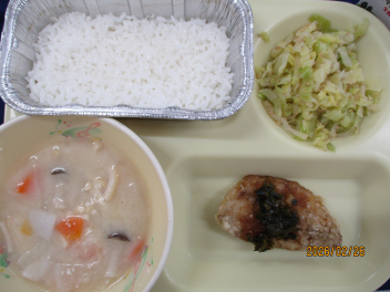 今日の給食は、ごはん、牛乳、あじのねぎソースあえ、たくあんあえ、ごじるでした。今日の汁物は、みそ汁と少し違いました。何が違うかというと、大豆をすりつぶした「呉」というものが入っていました。栄養いっぱいですねlaugh