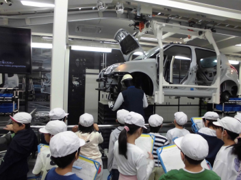 プレスや溶接など、迫力のある作業工程を見て、大興奮の子供たち。