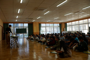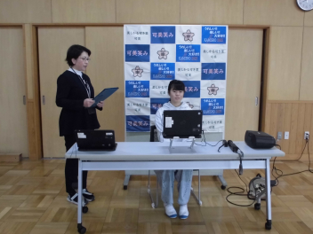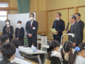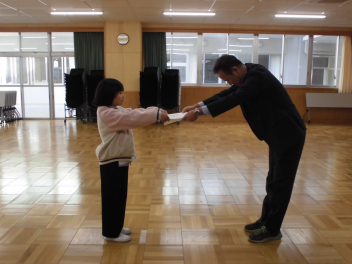 朝会の後、やらまいか書写コンクールで優秀賞に入った児童の表彰式を行いました。