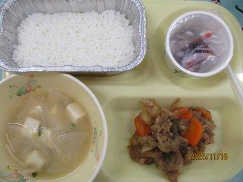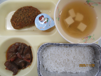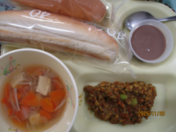 •  今日の給食は、パン、牛乳、豆腐スープ、豆のドライカレー、ココア豆乳プリンでした。今日の献立は、大豆や大豆から作られた食べ物をたくさん使っていました。国語科で学習した3年生には、分かったかなlaugh