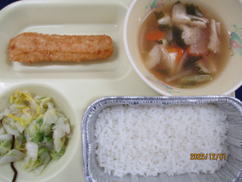 今日の給食は、ごはん、牛乳、実だくさん汁、いかの天ぷら、はくさい漬けでした。冬が旬の「はくさい」は、何枚も何枚も葉っぱが重なってできている野菜です。今日は、漬け物でしたねlaugh