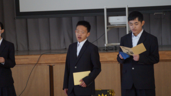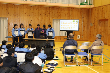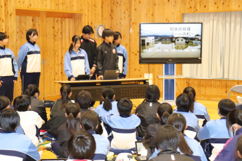 1月16日の5時間目に、防災学習の発表会を行いました。可美中学校の各地区の自治会長や、浜松市役所の危機管理課、健康安全課の方々にお越しいただきました。12月の参観会で発表した内容を修正したり、発表練習を行ったりして、よりよい発表ができるように頑張ってきました。今回は12月よりもさらにレベルアップした発表をすることができました。発表後は各地区の自治会長や危機管理課、健康安全課の方々からお話をいただき、各地区での防災対策の現状や浜松市が行っている取組について教えていただき、どの生徒も真剣に話を聞いていました。