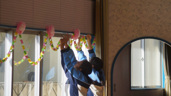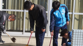 一つ目に行ったのは、可美幼稚園の卒園式の準備や環境整備を行いました。元気いっぱいの園児とも触れ合いながら、一生懸命に掃除をしました。