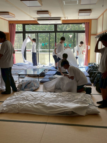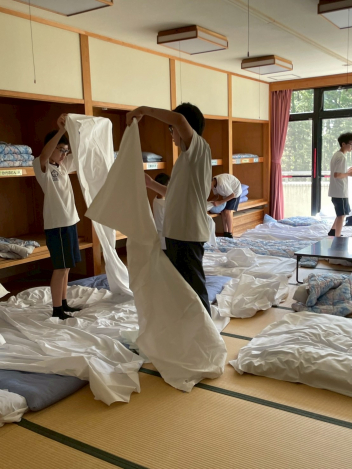 • 大漁ハイクを終えて、施設内に移動して宿泊する部屋へ到着しました。さっそくリネンの準備をしています。