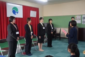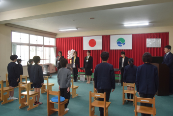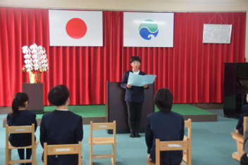 6年生の代表児童が、上阿多古小学校に着任した4名の先生方に、歓迎の言葉で出迎えてくれました。