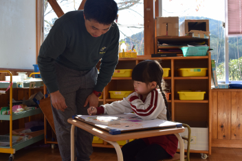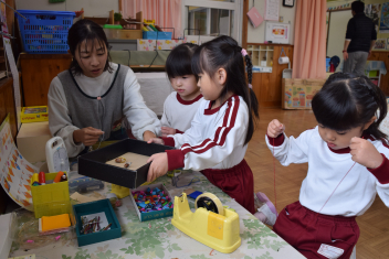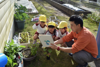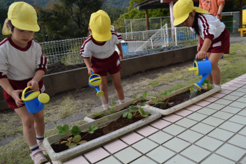朝、身支度が終わると冬野菜のお世話をしてやりたい遊びを楽しんでいるこどもたち。