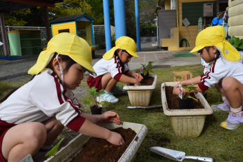 「黒いところを広げて、穴をあけて玉ねぎ入れて土をかけてあげるんだよ!」と植え方を教えてくれました。