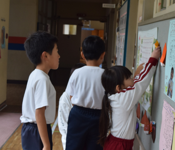 折り紙で葉っぱやドングリ、クリやカキなどの秋らしいものをたくさんつくり、教室に飾っていきました。
