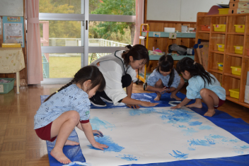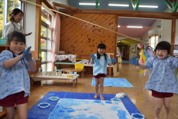 両手を絵の具だらけにして、真っ白だった模造紙が海の色に変身
