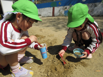 ジャリジャリの砂や、ドロドロの土を使って質の違いを感じながら遊びました。frown