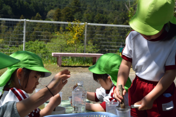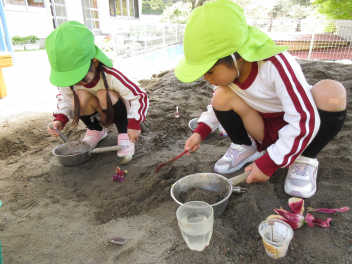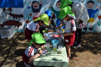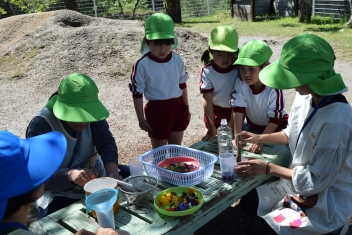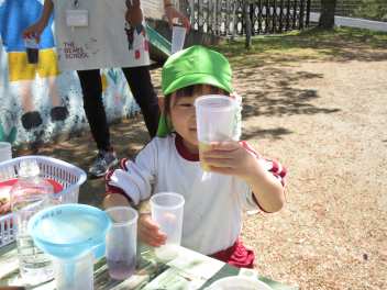 園庭では、先生たちが色水遊びをしていましたよ。wink