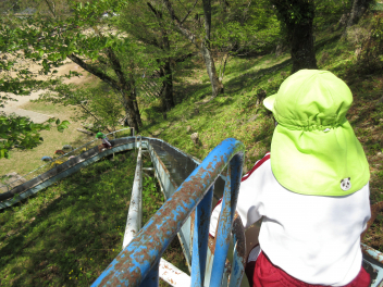 小学校の滑り台は長くてカーブしているから楽しいね。smiley