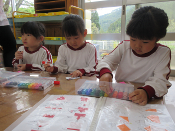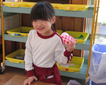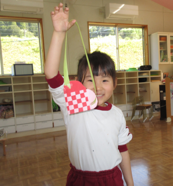 室内ではビー玉転がし遊びの景品づくりのため、折紙で製作をしました。