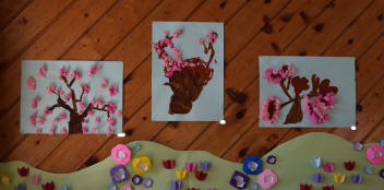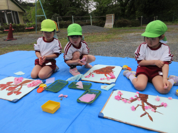 絵の具で木をかいた後は、花紙を丸めてはなびらをのりで貼り付けました。丸め方を工夫しながら素敵な作品ができました。wink