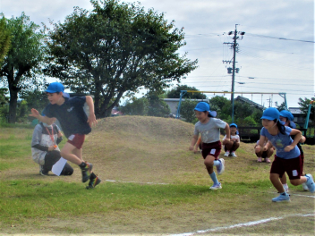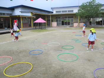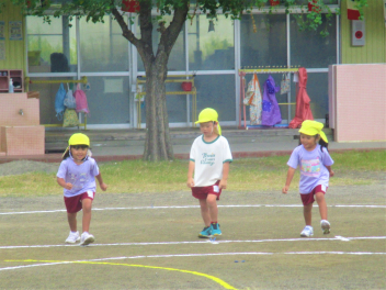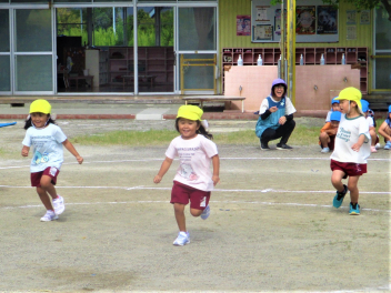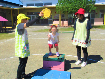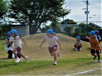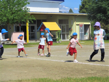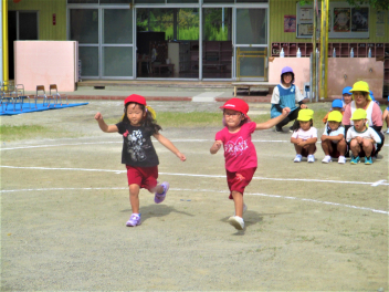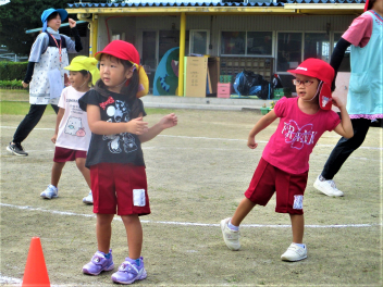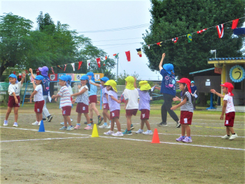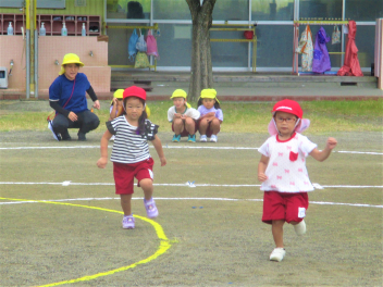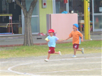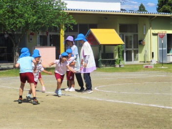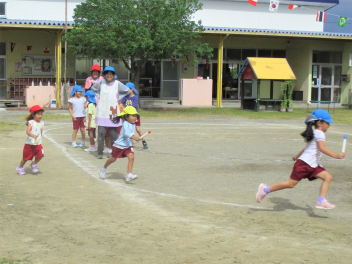 小さい友達も一緒に遊べるように、年長組が走る順番を決めてあげて、同じチームになって楽しみました。