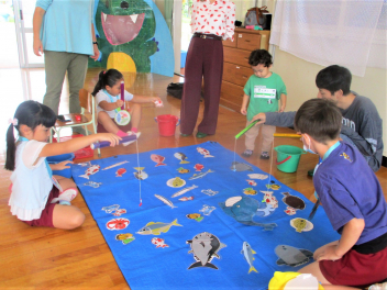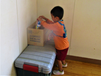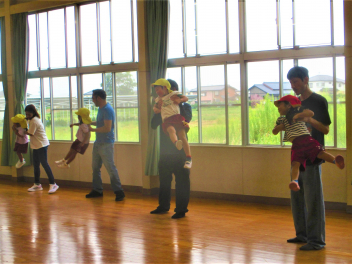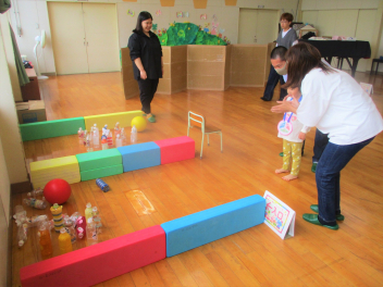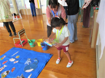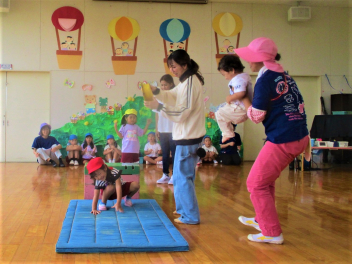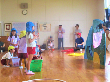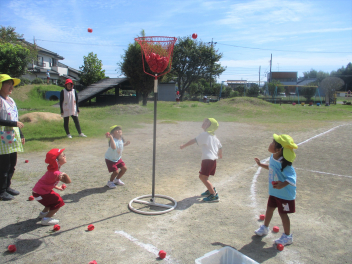 年少組にはかごが意外と高くて難しいのですが、年中組がやり方を見せてあげて、真似をしながら一緒に楽しんでいました