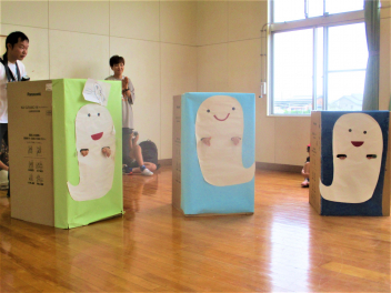 年長組(青) vs お家の方(白)で、オセロのように段ボールをチームカラーに変えて、その数を競いました。