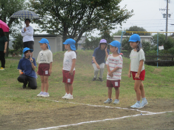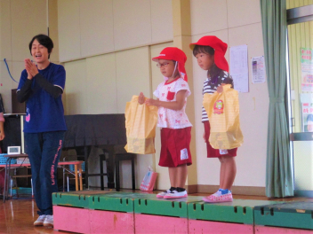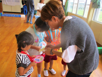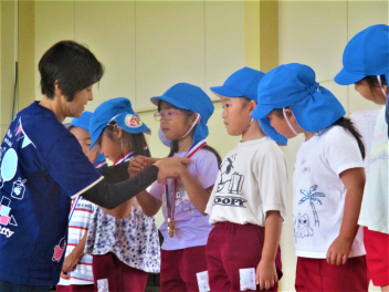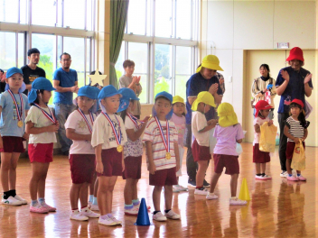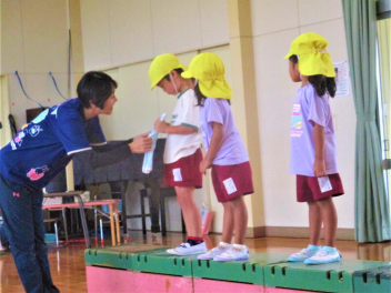 初めて運動会を経験した年少組も、前に出て園長先生からご褒美をもらうことができました。