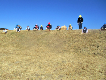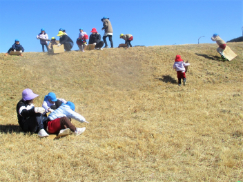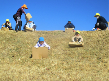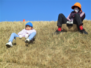 草が刈りこまれているこの時期は、絶好の草滑りスポットになります