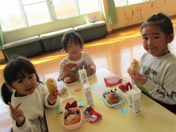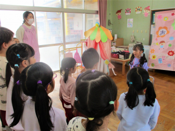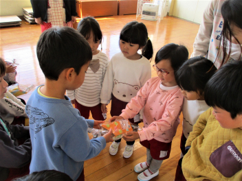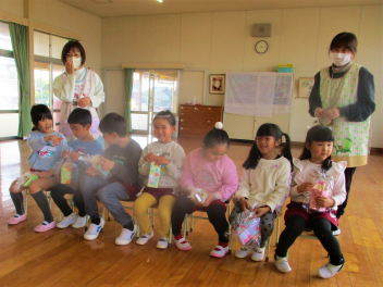 鬼をやっつけた後には、お母さん先生が変身した福の神が来てくれて、みんなに福がつまったお菓子を分けてくれました。