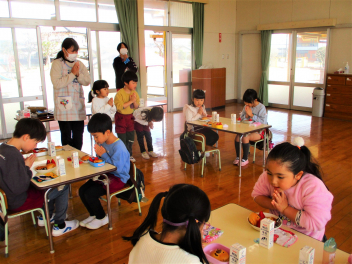 お楽しみのひなあられは、ひな祭りにちなんで、貝合わせカードで見つけたペアの友達と一緒に食べました。