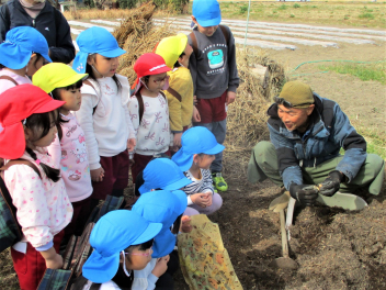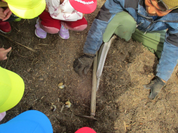 園庭の畑では、年中組と年少組が一緒にじゃがいもを植えました