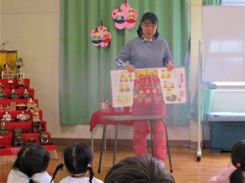 ひなまつりのお話を聞いたり、飾りを見たりしながら、ひな祭りの由来に触れました。