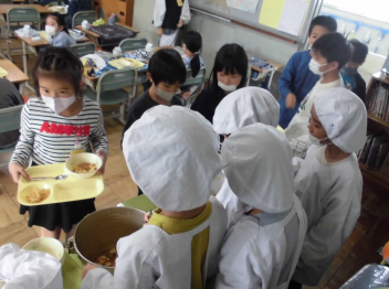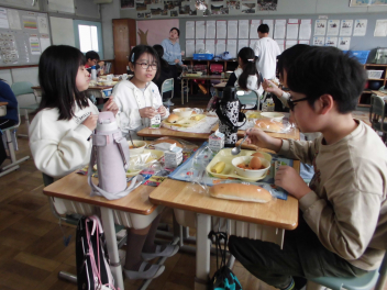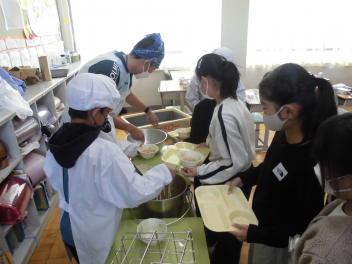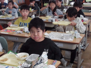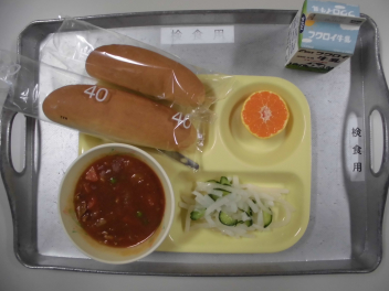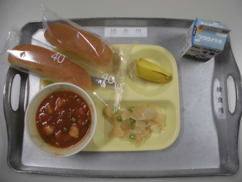 「ポークシチュー」には。たっぷりの豚肉と玉ねぎ、人参、グリンピース、じゃがいもが入っていました。じゃがいもがほくほくしていて、グリンピースの緑がいいアクセントになっていました。給食室手作りのブラウンルーとトマト缶とでじっくり煮込んだシチューはとても濃厚で、身体が温まり、ほっこりとしました。