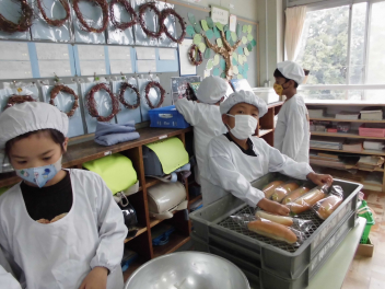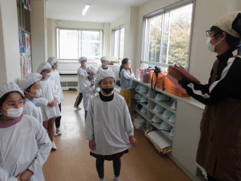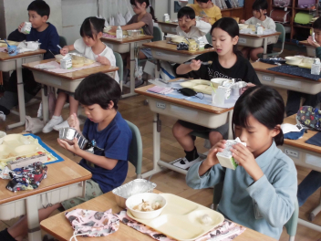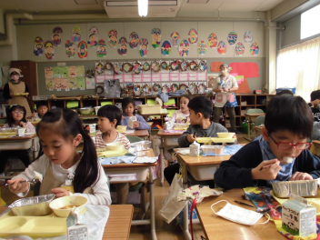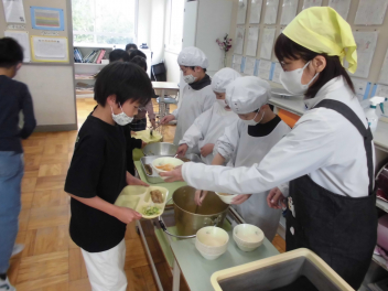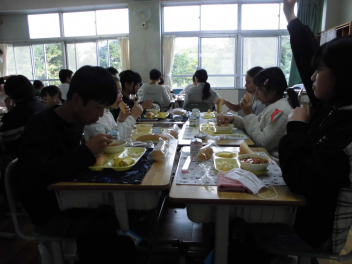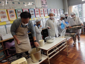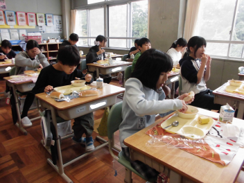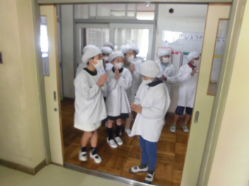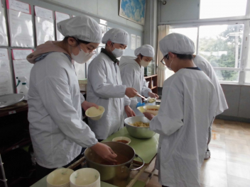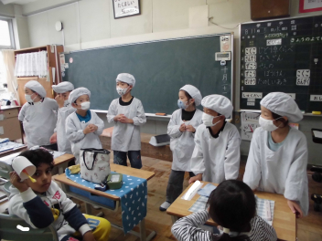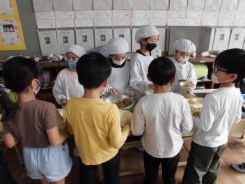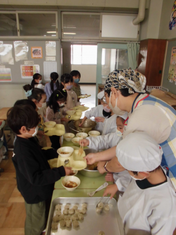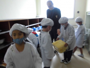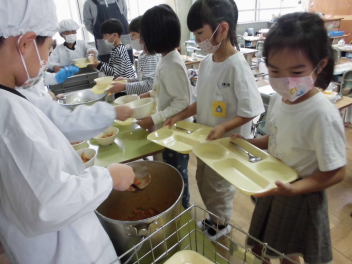 「ミートボールシチュー」には、ミートボールと玉ねぎ、人参、マッシュルーム、グリンピースが入っていました。ミートボールが入っていると、自然と笑顔になります。給食室手作りのブラウンソースで、じっくりと煮込みました。まろやかでとても美味しかったです。