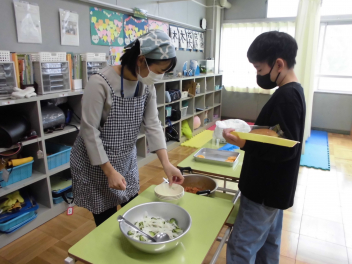 「大根サラダ」は、茹でた大根と枝豆をドレッシングで和えました。大根の切り方を工夫したそうです。シチューが濃厚で、サラダはさっぱりとしていて、とてもバランスが良かったです。
