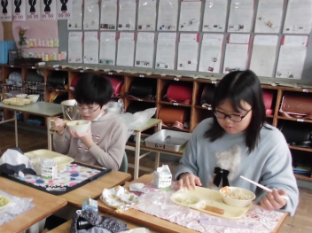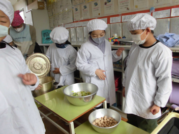 「五目豆」は、大豆をこんにゃくや人参、れんこんとともに煮ました。食べやすいように、食材を角切りにしたそうです。大豆のしっとり感とれんこんのコリコリ感のバランスが面白い食感でした。