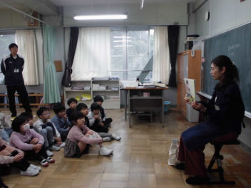 今日のテーマは「共助」。共助とは、災害等が起きたときに、自分や家族の安全を確保した後、近所や地域の人と助け合うことです。齋藤様からは、防災倉庫にどんなものに入っているものやその使い方、避難訓練の重要性などについて教えていただきました。また、非常食や非常用トイレ、ラジオなどの実物を見せていただきました。特にラジオは懐中電灯やサイレンの機能がついていたり、手動で充電できたりと、高性能で、子供たちもびっくりしていました。