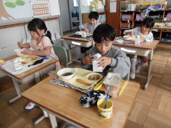 「豆乳汁」には、豆乳が入った味噌汁です。食材は、油揚げや大根、ぶなしめじが入っていて、栄養満点です。