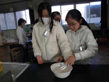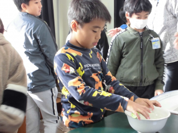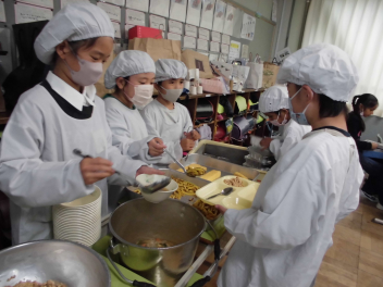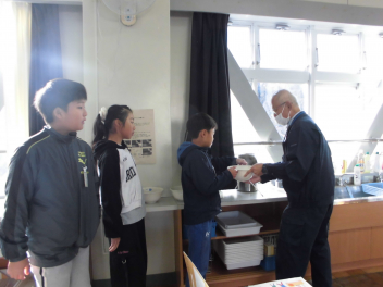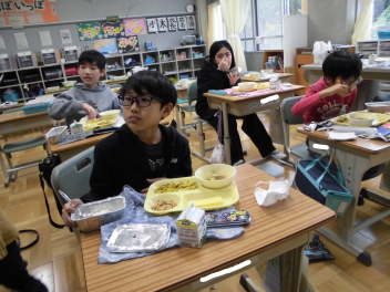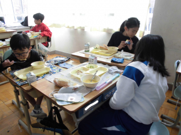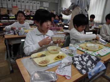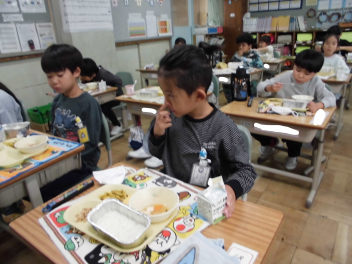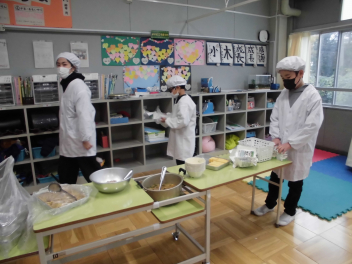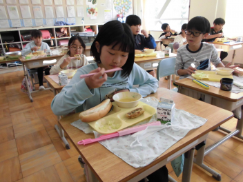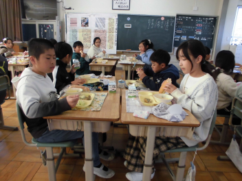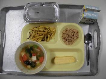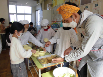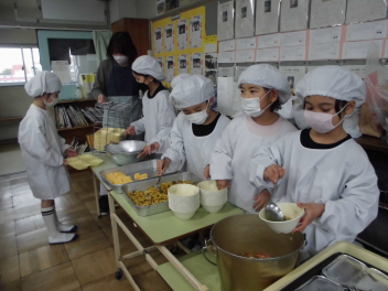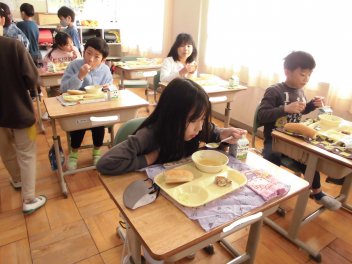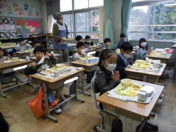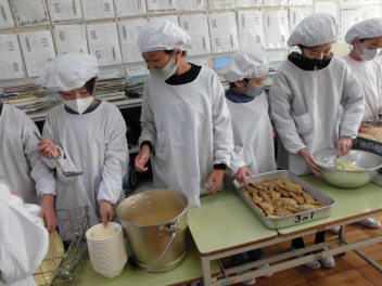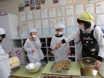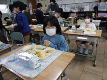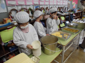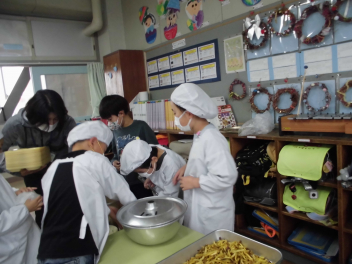 「さつまいもスティック」は、なかよし学級の子供たちがなかよし農園で育てたさつまいもを油で揚げて、塩で味付けしました。鴨江小オリジナルメニューです。さつまいもがほくほくしていて、塩加減が絶妙でした。