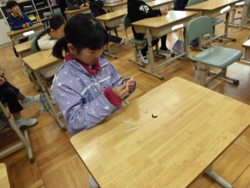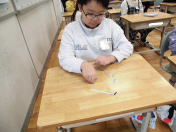子供たちは、3種類のストローから3本を選び、モール3個を使って、三角形を作ります。