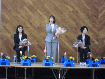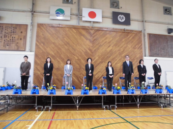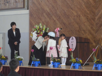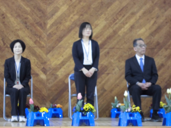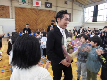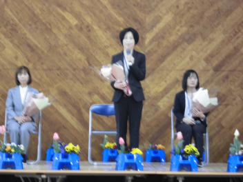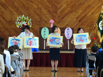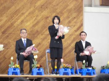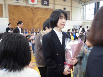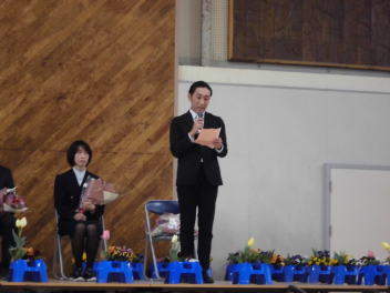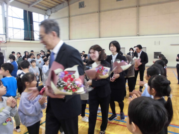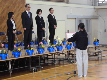 校長先生とPTA会長さんから、式辞やお祝いの言葉をいただきました。どの子も真剣に聞き、「これからどんな困難に遭っても、しなやかにたくましく進んでください。」という言葉に、大きくうなずいていました。5年生や職員と一緒に歌う校歌も今日が最後になります。