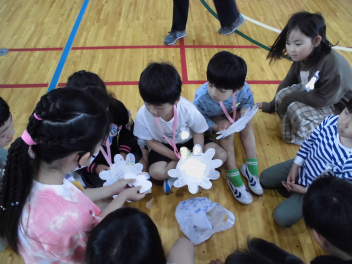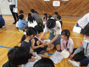 2~6年生が自己紹介をしながら、同じグループの1年生に、花びらに書いたメッセージカードをプレゼントしていきます。