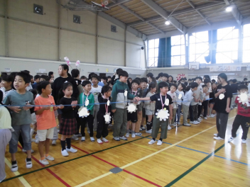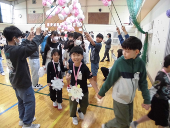 5年生の花道をくぐり、2~5年生の温かい拍手に包まれながら、ペアの6年生と退場していきました。