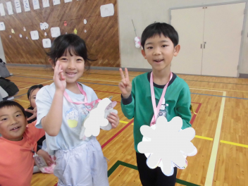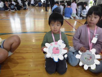 同じ班の2~6年生全員からメッセージカードをもらって、素敵な花のメダルが完成し、とても嬉しそうな1年生でした。