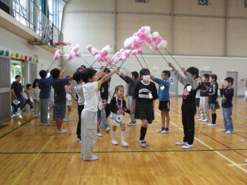 5年生は花道をつくって、他の学年は温かい拍手で、1年生を迎えました。