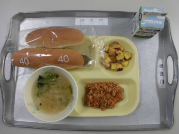 「野菜スープ」には、キャベツや玉ねぎ、スイートコーン、ほうれん草の食材が入っていました。今日は人参が入っていなかったので赤色がなくて、少し寂しい彩りでした。だけど、とっても美味しかったです。