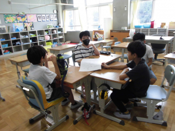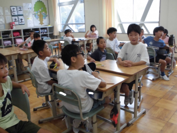「今、どんな昆虫が見られるかな?」という問い掛けに対して、「セミ」「トンボ」「カブトムシ」・・・などの意見が出されました。