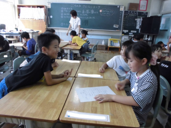 「今までに学習したことを活用して、考えてみよう。」の投げ掛けで、子供たちは自分の考えをノートに書いていました。